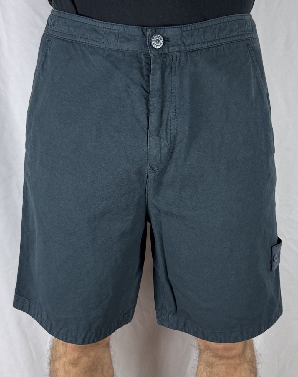 Шорты-бермуды Stone Island L100003 COTTON LINEN CANVAS_S.I.GHOST комфортного кроя из хлопково-льняной ткани с боковыми карманами, задними накладными карманами и завязками на поясе. Окрашены в готовом виде.